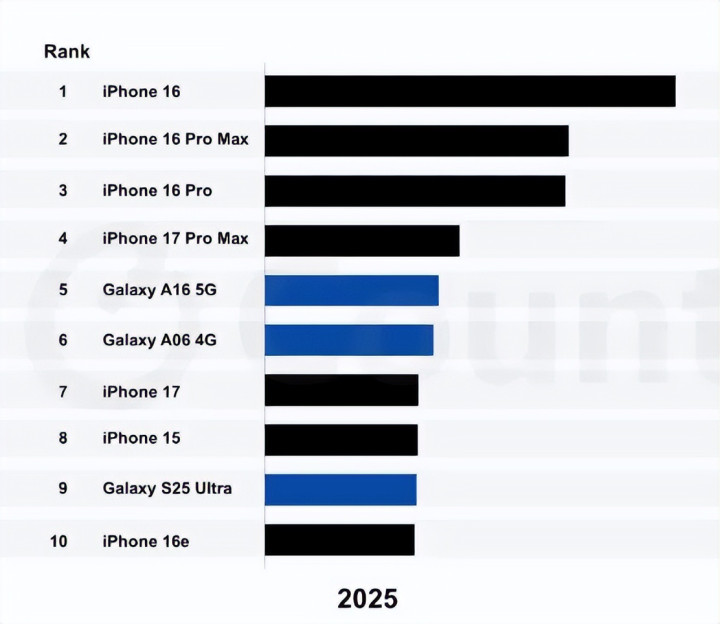同时,三星旗下也有多款产品进入了这个榜单。其中,三星Galaxy A16 5G跻身前五,Galaxy A06 4G排名第六,高端定位的Galaxy S25 Ultra排名第九。